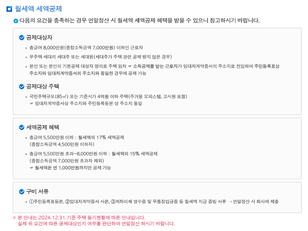| 월세 공제 조건 | 무주택 세대주 + 총급여 8,000만원 이하 + 국민주택규모 |